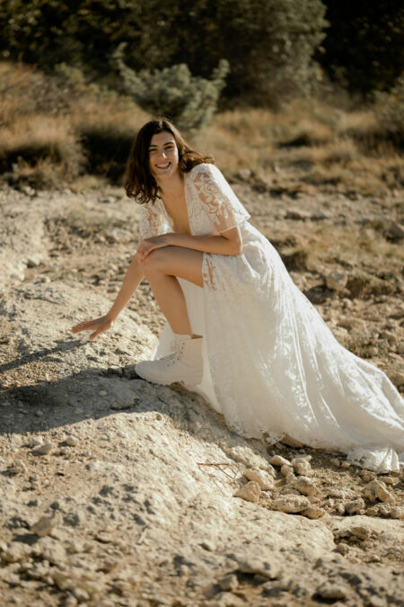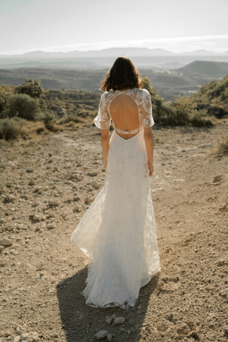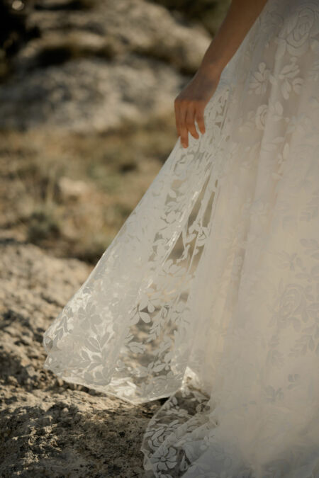 MISTRAL est une robe de mariée moderne en tulle brodé de fleurs graphiques. C’est une robe de mariée légère pour une mariée contemporaine qui aime surprendre par de nouveaux codes.