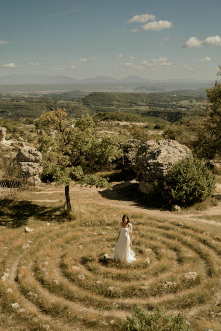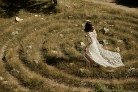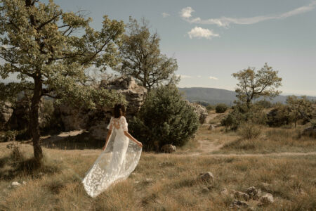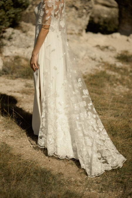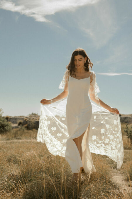 NOUR est un long gilet de mariée en tulle brodé de coquelicots. L’ensemble de mariée robe et gilet conviendra aux mariées modernes et chic.
