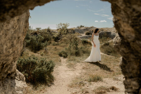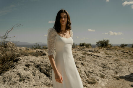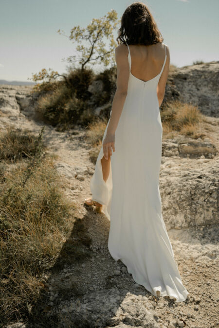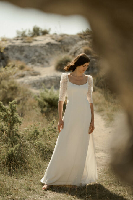 MERCI LA VIE est une robe de mariée moderne et sexy en crêpe de soie. C’est une robe de mariée avec des manches bouffantes amovibles en organza brodé.