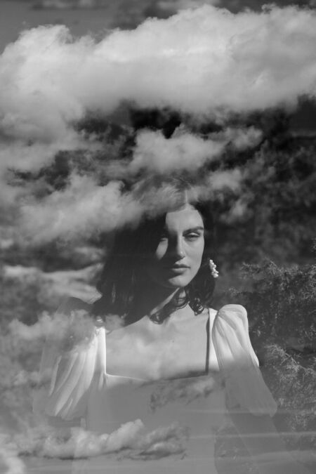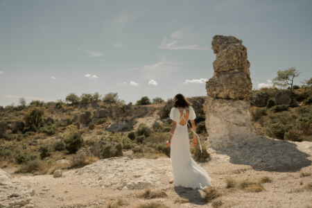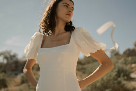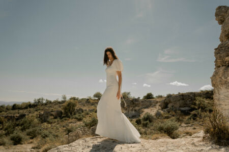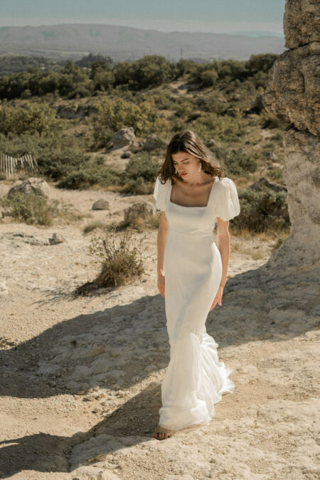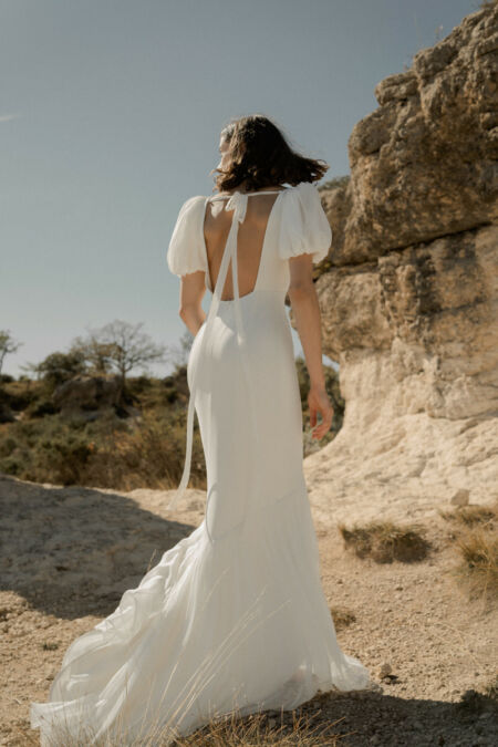 MUSTANG est une robe de mariée fourreau en crêpe de soie ornée de manches balon et d’une traine vaporeuse en mousseline de soie. C’est une robe de mariée couture pour une mariée chic et moderne .