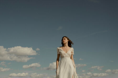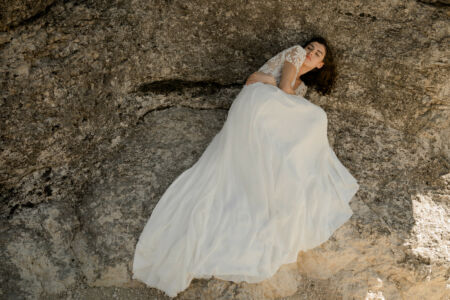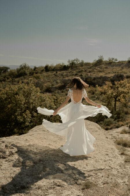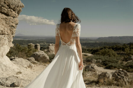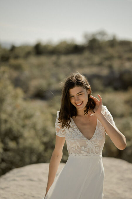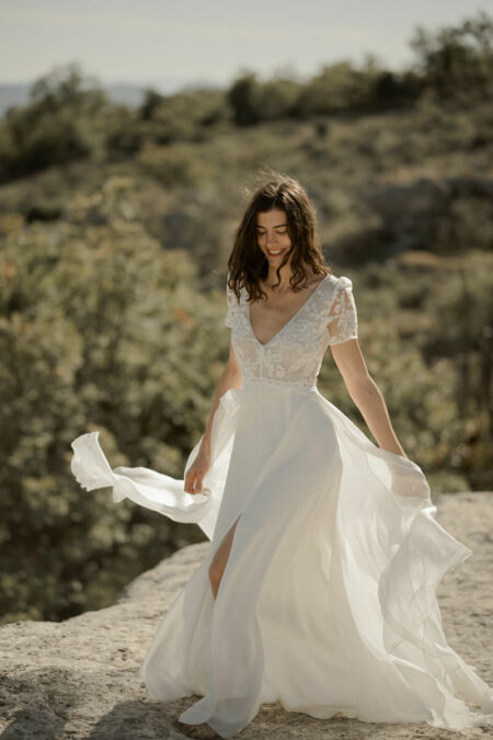 MARY est une robe de mariée fluide en tulle brodé de fleurs graphiques et mousseline de soie. C’est une robe de mariée légère et fraiche pour une mariée romantique moderne.