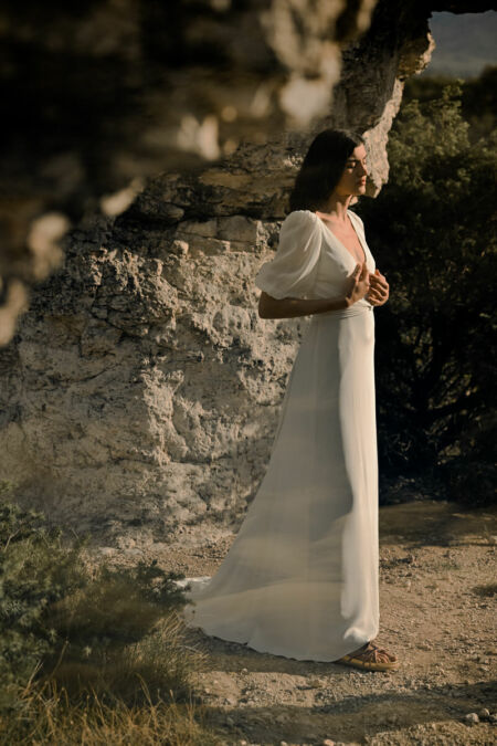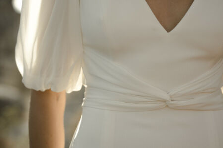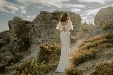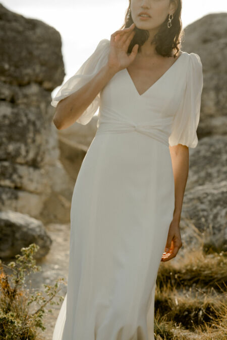 MIRACLE est une robe de mariée minimaliste en crêpe de soie et des manches bouffantes en mousseline de soie. C’est une robe de mariée couture avec un grand décolleté dos étonnant pour une mariée audacieuse qui cherche force et douceur.