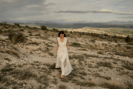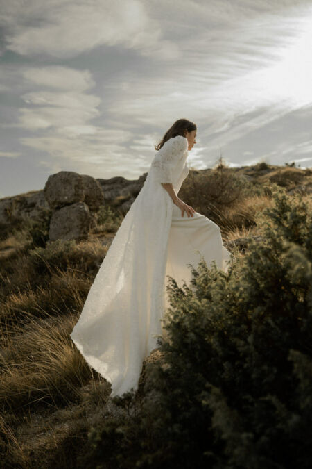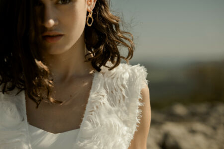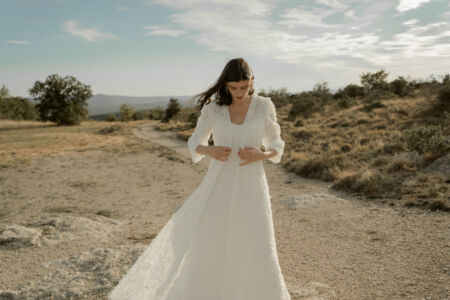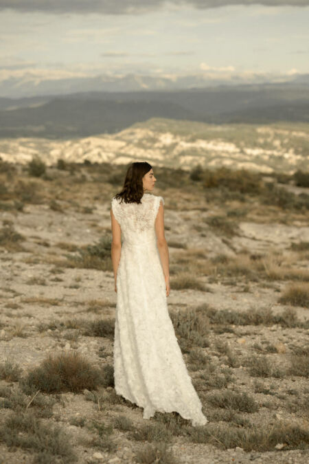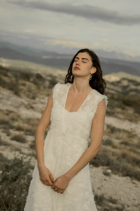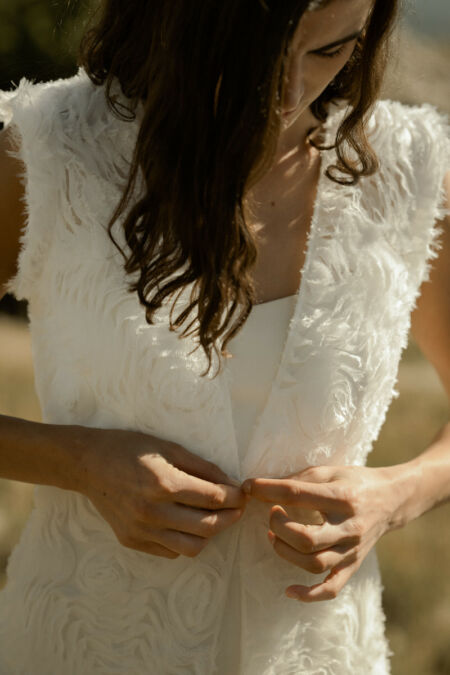 NIRVANA est un manteau de mariée en tulle brodé d’organza. MAMAMIA est un gilet de mariée en tulle brodé d’organza. C’est un ensemble de mariée moderne et contemporain pour celles qui cherchent à éblouir par force et simplicité.